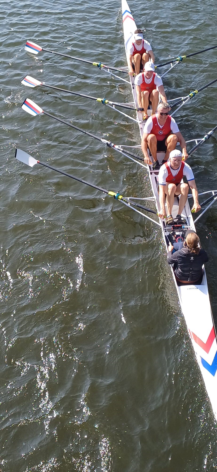 Es wurde mit Zeitabstand fliegend gestartet. Unser Gegner im Master C 4X mit Steuermann/frau starteten rund 15 Minuten vor uns, weil ein Teil der Mannschaft zum Regatta Team gehörte und möglichst früh vom Wasser sollte.
